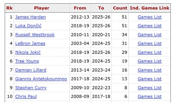 除了东契奇外,其他现役球员能否打破哈登的这个纪录呢?答案是希望不大,威少排名现役第二,他做到了34次,詹姆斯第三,做到了31次,约基奇第四,做到了29次,特雷杨第五,做到了19次,他们和哈登的51次差距还很大,他们想超过哈登难度非常大。